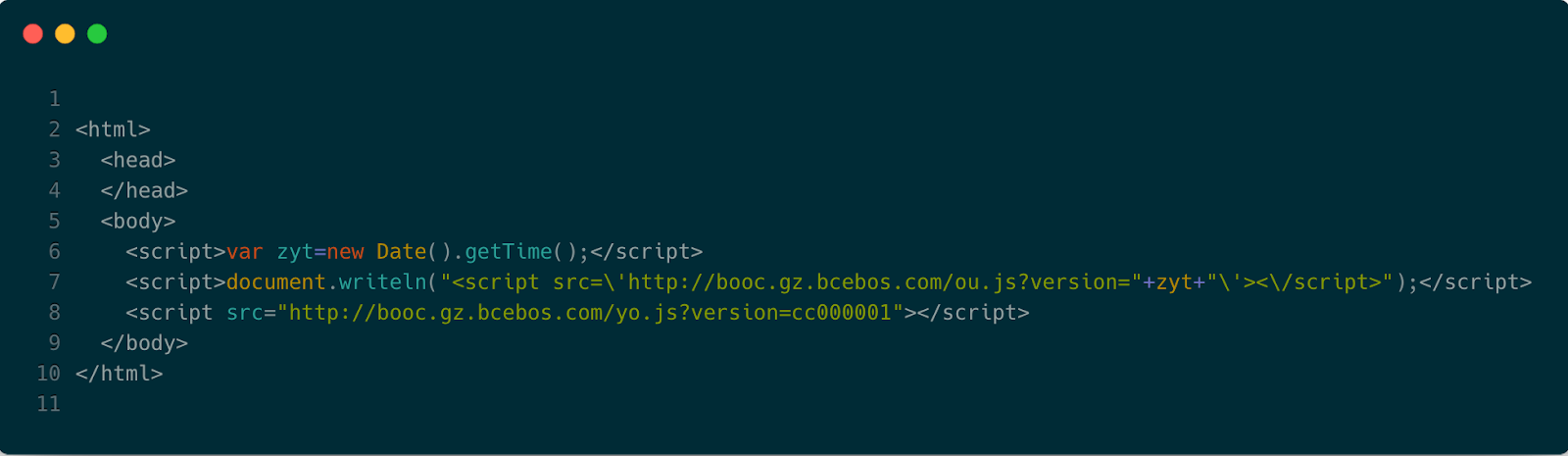 从Ping-To和Ping-From标头检查you.html页面时,Imperva能够了解发生了什么。you.html页面(如下所示)加载了两个可执行HTML ping DDoS攻击的JS文件。