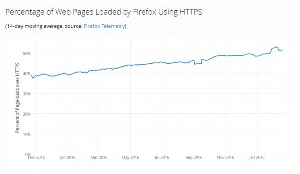 从下面的图表可以看出,Firefox在过去两年中HTTPS流量稳定增长,从2015年10月的37.81%上升到2017年2月的52.93%,Chrome也有类似增长情况。根据Google自己的数字,本月Chrome中的Windows用户访问的网站中有55%是通过HTTPS加载。