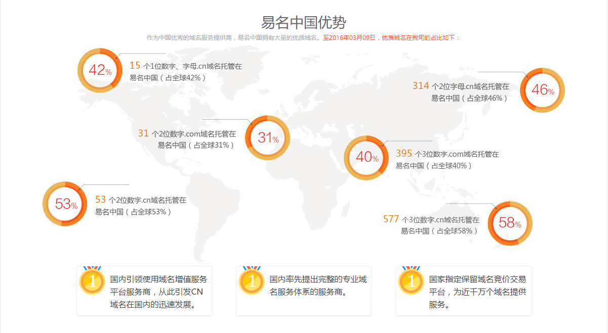 为中国优秀的域名服务提供商,易名中国创造了多项国内域名行业的众多第一:国内第一家使用域名增值服务平台服务商,从此引发CN域名在国内的迅速发展。国内第一家提供域名停放服务商,让广大域名投资者减少域名投资负担。国内第一家提出完整的专业域名服务体系的服务商。