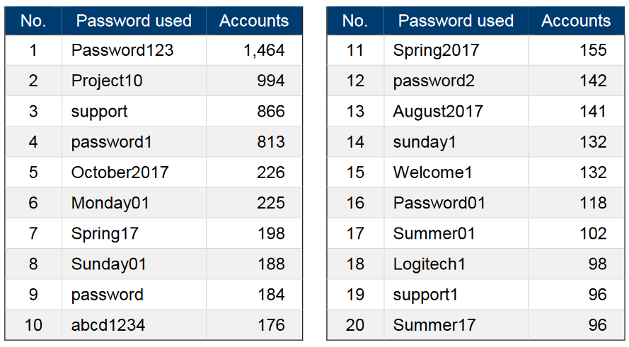 据《华盛顿邮报(Washington Post)》记者Taylor Telford的报道,其中一些弱密码应该是黑客所喜欢的。比如,其中有1464人使用“Password123”作为自己的密码,813人使用的是“Password1”,而有近200人直接使用“Password”,并且这些密码似乎自创建以来就没有被更换过。另外,其中有1.3万个密码基于季节和日期的组合,如“Sping2017”或“October2017”,以及有近7000个密码使用了“123”这样的数字组合。