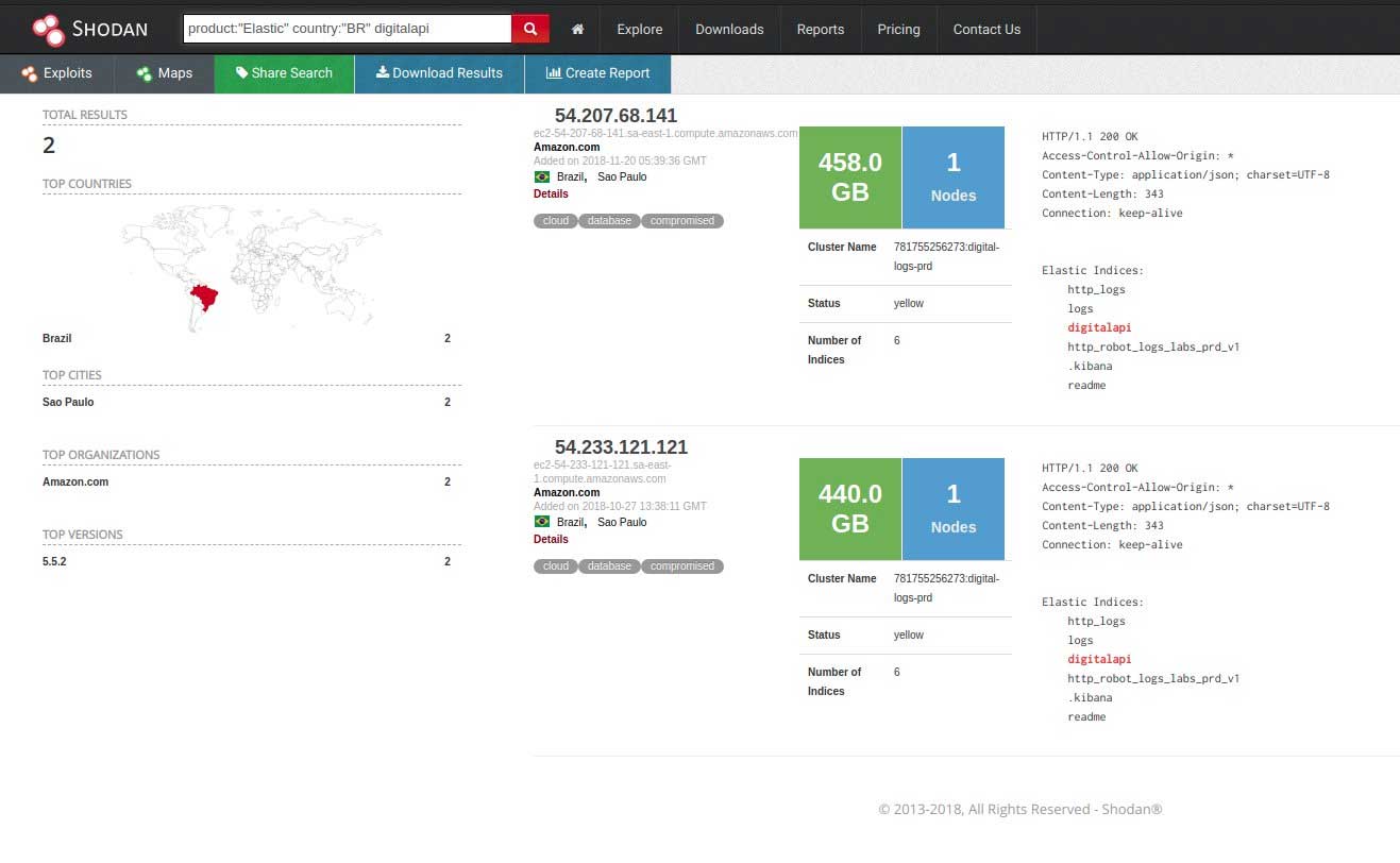 在服务器在线曝光后随之被Shodan索引,Shodan是一个寻找互联网连接设备的搜索引擎。通过使用Shodan搜索引擎的高级功能,能够在巴西发现运行Elasticsearch的多台服务器,这些服务器无需身份验证即可获取信息。