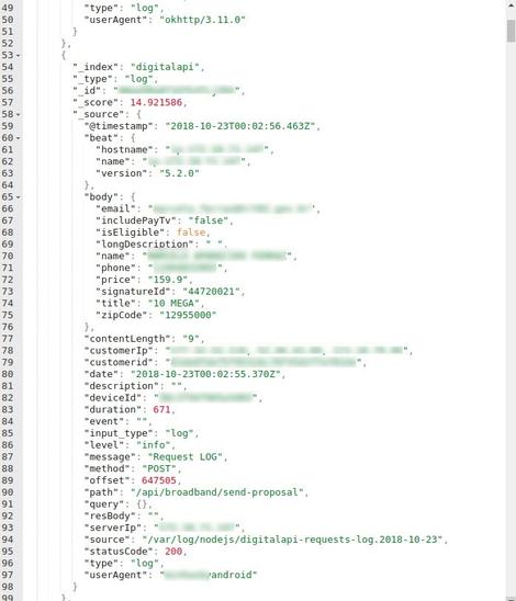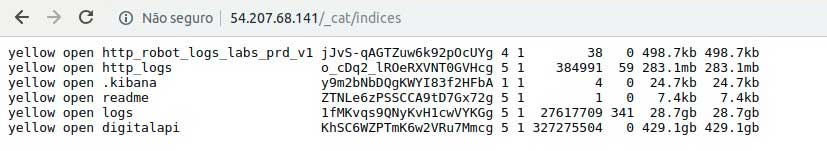 虽然最初,卡斯特罗不知道这个服务器(可以通过两个IP地址访问)属于谁,包含在内的数据保留了所有他所需的线索。他表示服务器存储了属于Sky Brasil的日志和API数据。一组名为“digital-logs-prd”的服务器引起了他的注意,用简单的命令列出了可用的索引,发现了28.7GB的日志文件和高达429.1GB的API数据。