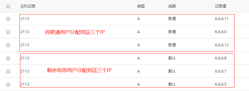 ① 联通用户记录设置主机头相同,线路为联通,IP地址不同。