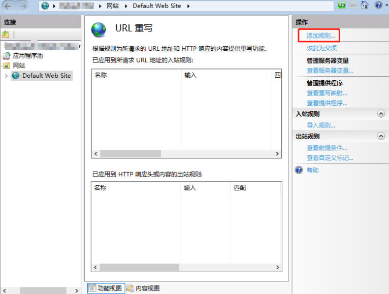 3.进入 “URL 重写” 页面,并单击右侧 “操作” 栏的【添加规则】。如下图所示:
