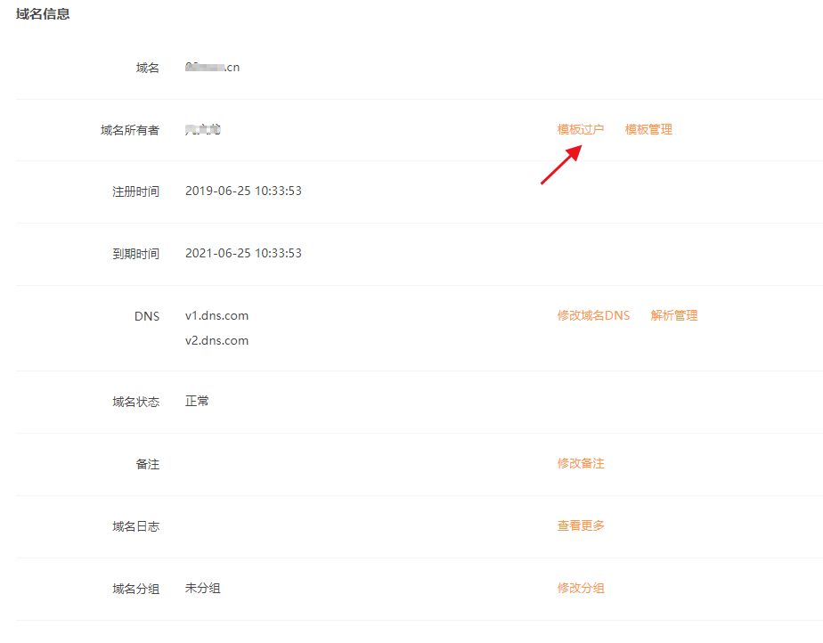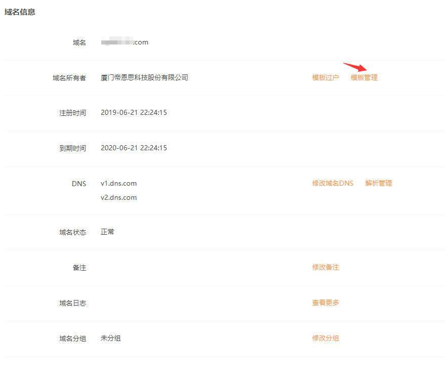 8、 实名认证完成后返回域名列表,点击右侧管理-模板过户