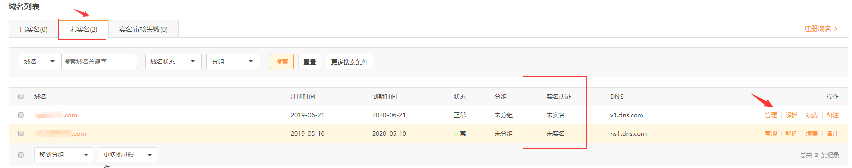 5、注册完成后进入域名管理列表,状态则会显示“未实名”状态,点击对应操作列的管理功能进行实名认证。