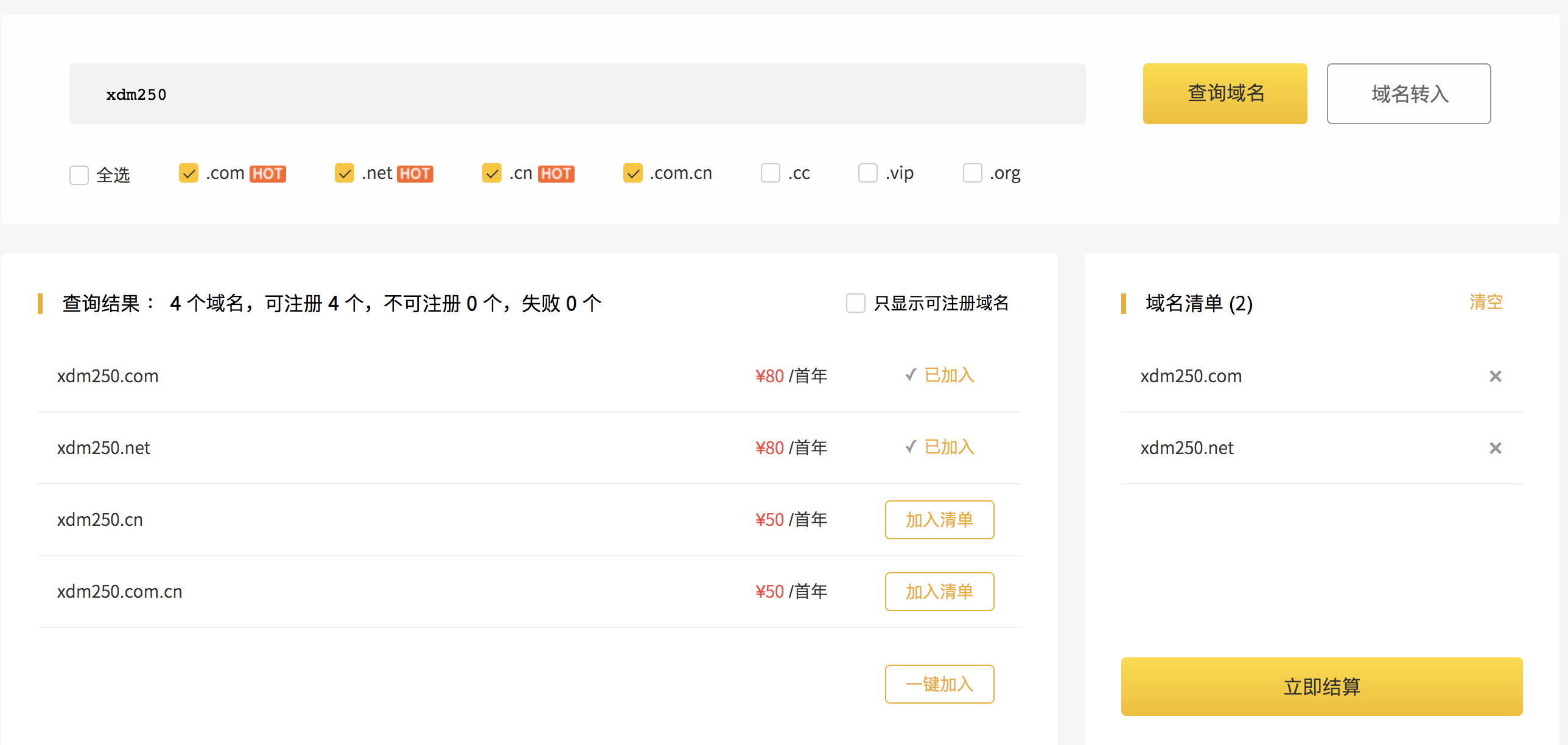 域名显示可注册后可以将新域名“注册结算”后点击“下一步”即可。