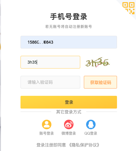 填完手机号码后,点击【获取验证码】或右上角直接微信扫码登入即为注册