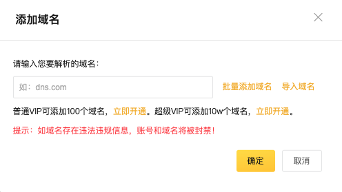 2、点击添加域名,输入您要解析的域名,点击【确定】。