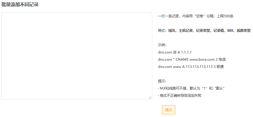 和 批量添加相同记录 的 多行添加 类似,但无需在域名列表页勾选域名。进入操作页面后,直接在文本框内输入要操作的对象域名。