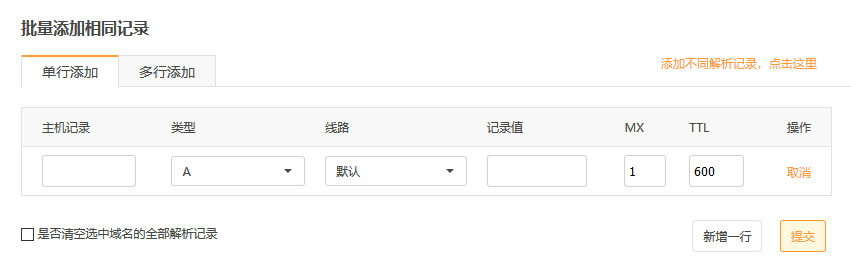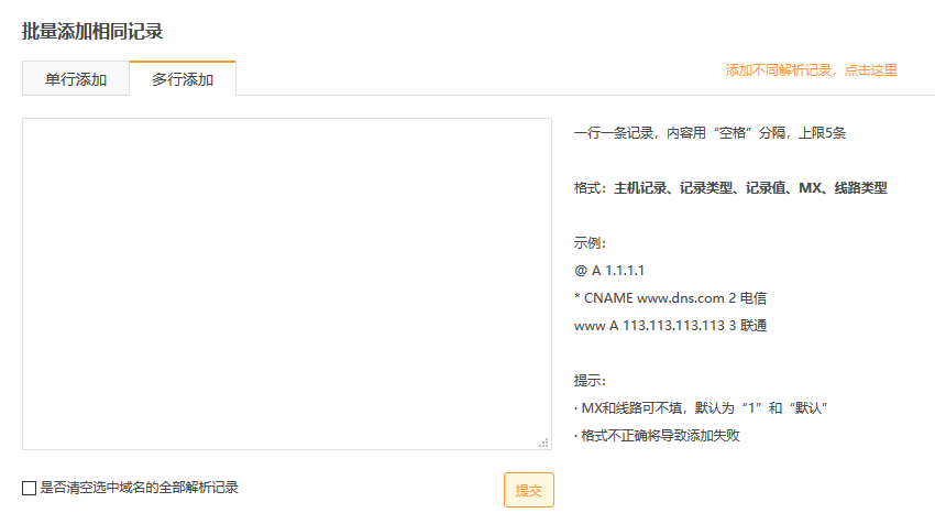 注意:当勾选“是否清空选中域名的全部解析记录”后,将清空选中域名的原有解析记录!!!