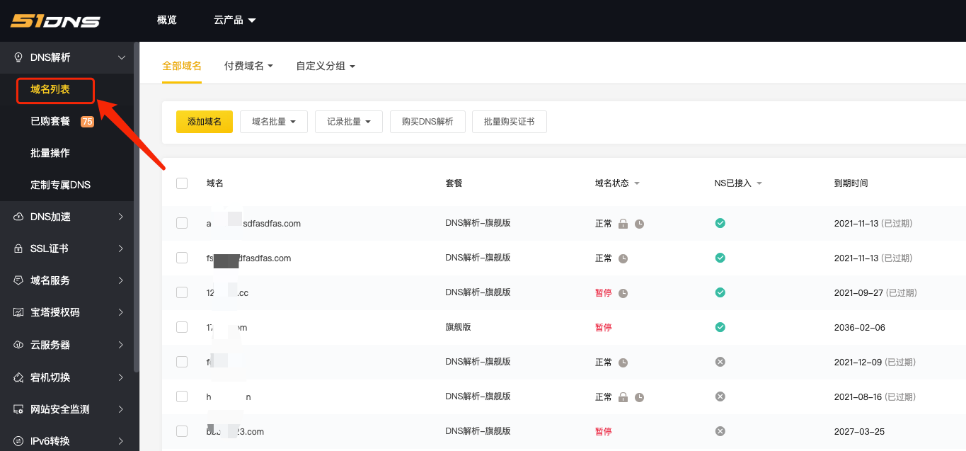 1、登录51dns.com,进入控制台-DNS解析-域名列表页面: