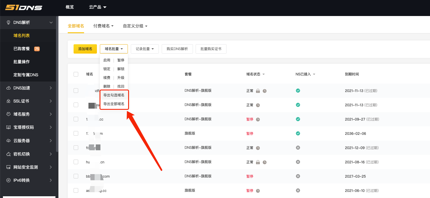 2、点击“域名批量”,选择【导出全部域名】或【导出勾选域名】