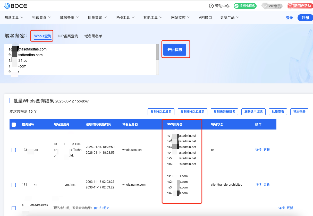 使用whois功能进行批量查询,即可批量查看域名对应的NS地址